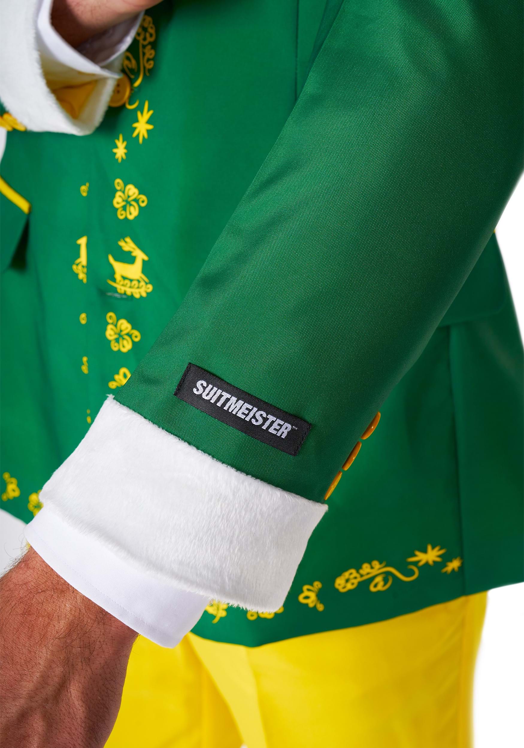 Made from 100% polyester and officially licensed, this suit includes a fully lined green jacket with a two-button front, white faux cuffs, and gold detailing that screams “North Pole executive realness.” The yellow pants feature an elastic waistband on the sides, a zipper fly, and a button closure—because even elf-wear needs to be bathroom-break ready.
