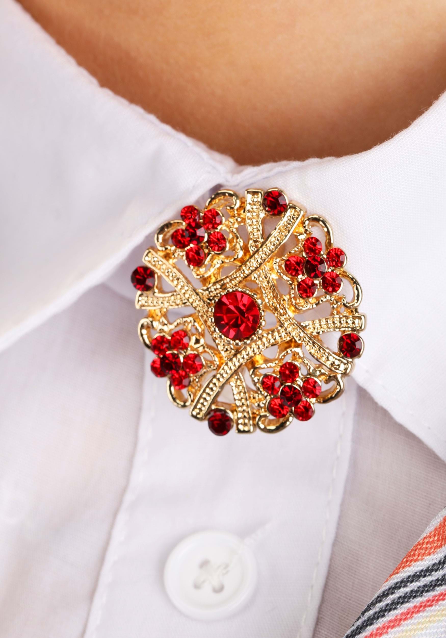 • Woven cotton shirt has buttons down center front, jersey knit panel on the back, gold with red jewels on the brooch