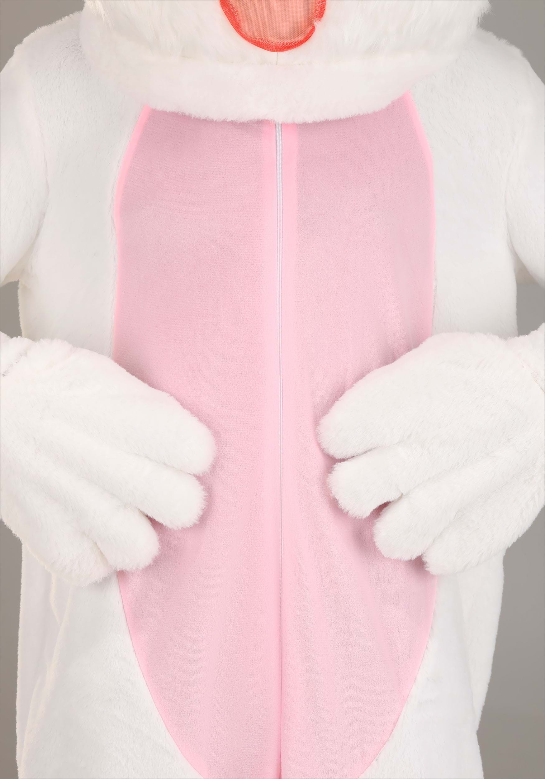 No Easter celebration is complete without the treat-hiding bunny! This Adult Mascot Easter Bunny Plus Size Costume zips up the back for easy dressing and is made of plushy white fabric so soft that it almost feels like real rabbit fur (it's not, though. We aren't Cruella de Rabbit.) A pink oval inset serves as the bunny's tummy detail, while padded gloves and shoe covers hide your hands and feet. The included full-head mask is designed to look like the Easter Bunny's smiling face, and has viewing ports so that you can see where you're hopping.