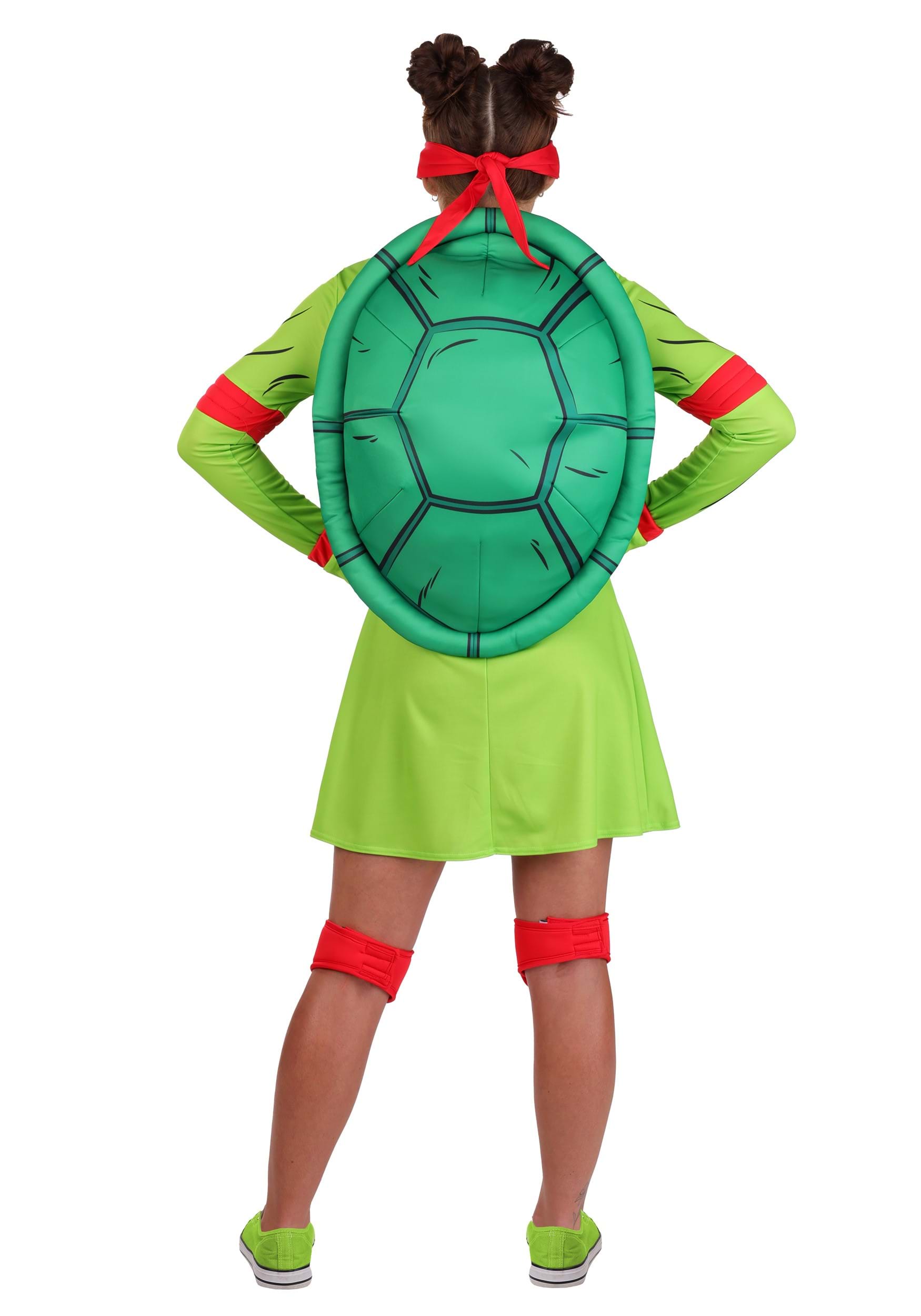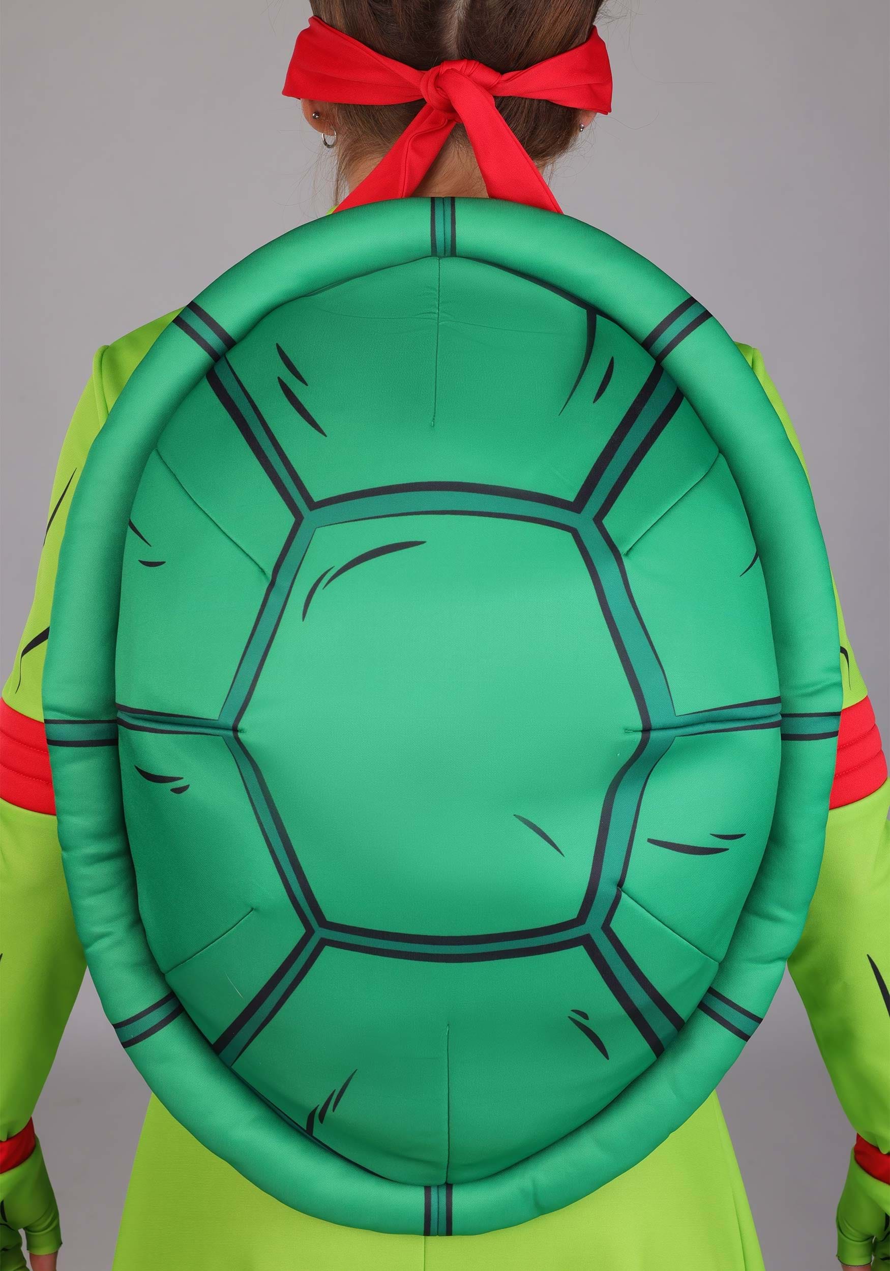 The look starts with all the right accessories: a red tie-on eye mask, red armbands, fingerless gloves with matching red wrists, and a pair of padded knee covers so you’re ready for any sudden sewer-based detours—or dance battles. The shell is a rich green and fastens to your back with a translucent shoulder strap, keeping your turtle silhouette locked in without weighing you down.