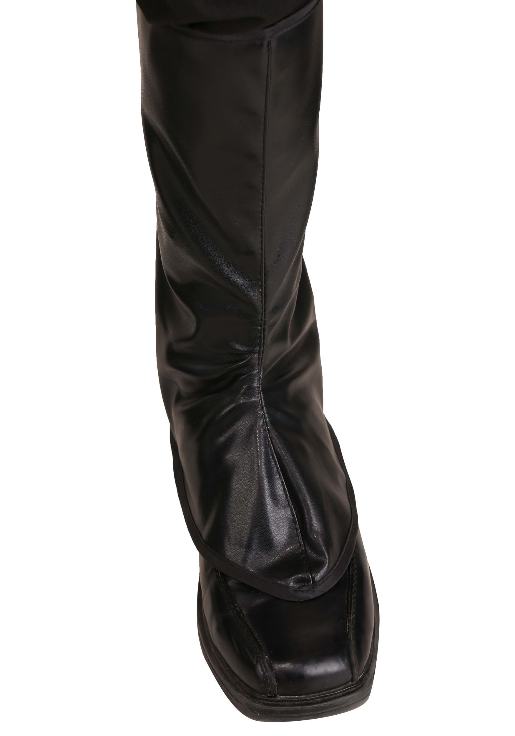 - Black vinyl boot tops have elastic bands to secure under feet