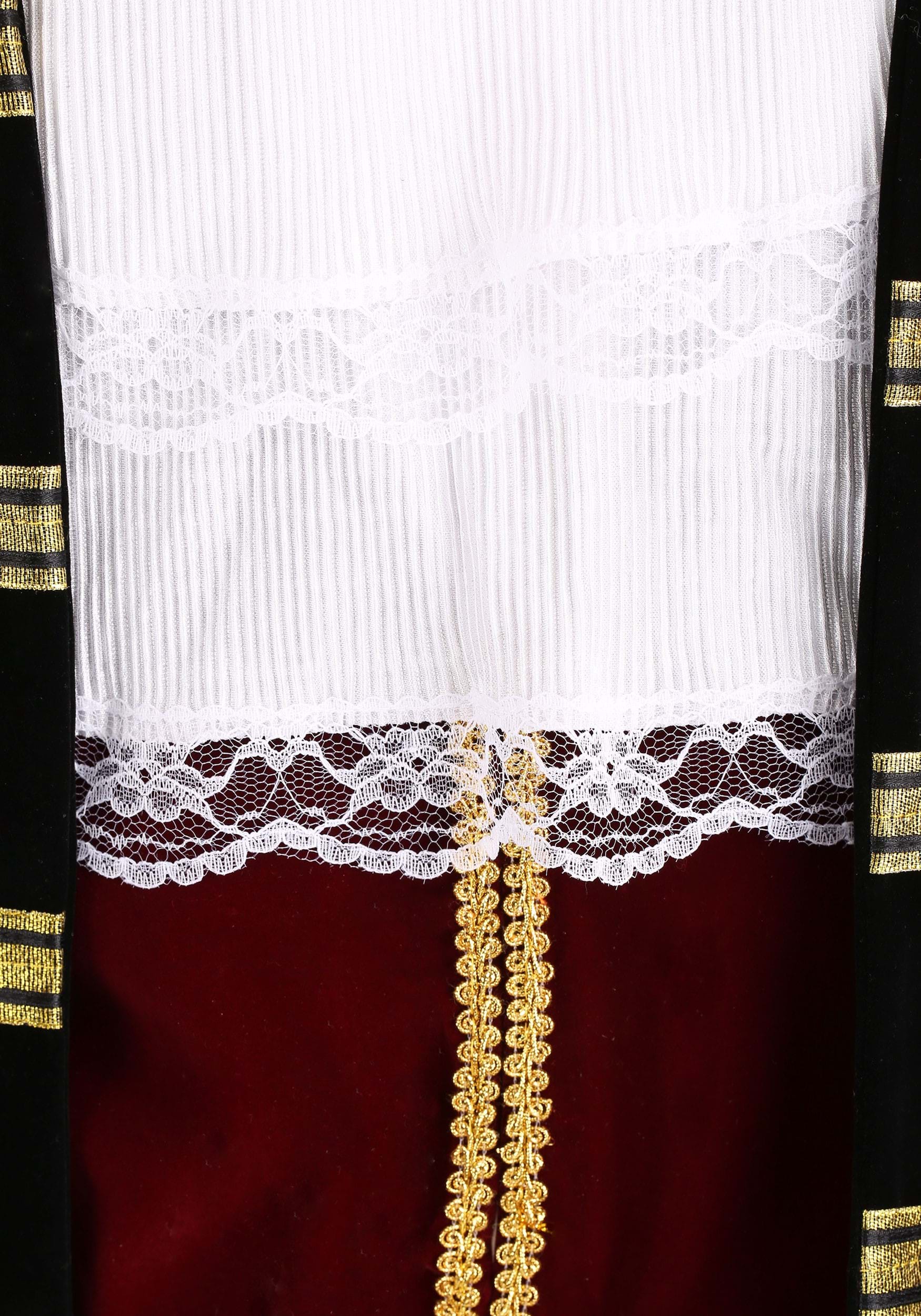 - Maroon velvet vest has high neckline, metallic gold braid edging