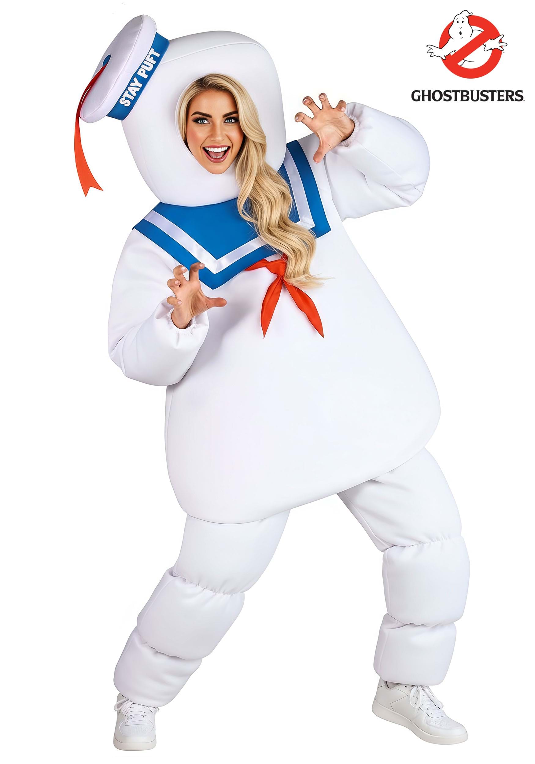 Fully licensed and ready for some serious fun, this Adult Stay Puft Marshmallow Man Costume will have people rolling in laughter as soon as you lumber into the room! While the bubble shape might look cumbersome, it's actually quite comfortable and is sure to keep you warm on chilly October nights. The costume features a padded tunic with an adorable sailor collar attached. Padded pants are layered underneath, making sure the costume is conveniant for bathroom breaks. You'll enjoy the unobscured vision and mouth access for snacking, as the headpiece has an opening for your whole face and secures around the back of your head with hook and loop strip fasteners. As this costume is Made by Us, you can be sure that this look can be enjoyed for Halloweens to come!