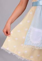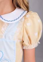The dress has puff sleeves trimmed with white ruffle lace to match the skirt hem and a Peter Pan collar decorated with blue ribbon. A white apron with a teddy bear applique, embroidered chest panel, small pockets, and a blue ribbon waistband is secured to the front of the costume dress. Dressing is quickly done thanks to hook-and-loop fasteners down the back, and the look is completed with a light blue clip-in hair bow.