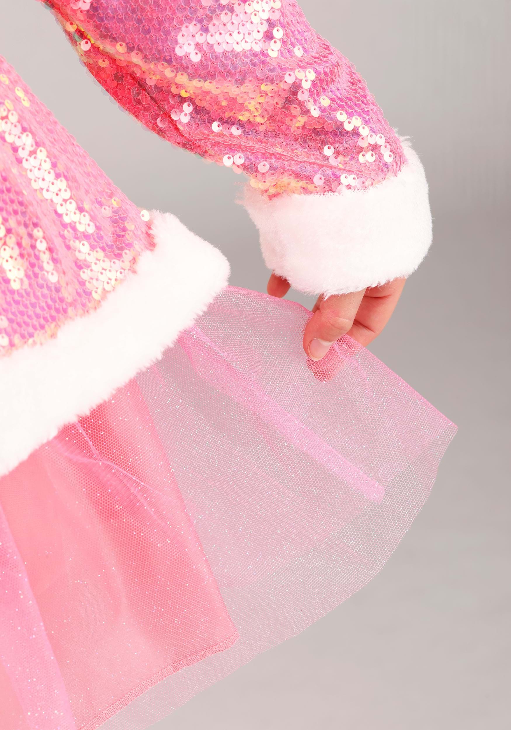 The costume includes a pink sequin dress with long sleeves, white faux fur trim, and a fluffy skirt layered with soft tulle. The bodice features decorative buttons and a classic collar, while a black belt wraps around the waist to tie the whole look together with a bit of Santa-inspired flair. It’s twirl-friendly, cozy enough for cooler nights, and designed to sparkle under Christmas lights—or center stage.