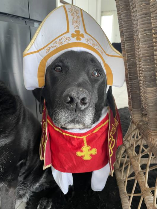 This positively adorable getup features a red cape with a printed gold cross that gets placed around your pup's front paws and fastens under his belly. The stole has a printed gold paw print and fastens to the costume. Finally, the miter headpiece has a chin strap and, due to his serene nature, your dog shouldn’t have any trouble keeping it on all day long.