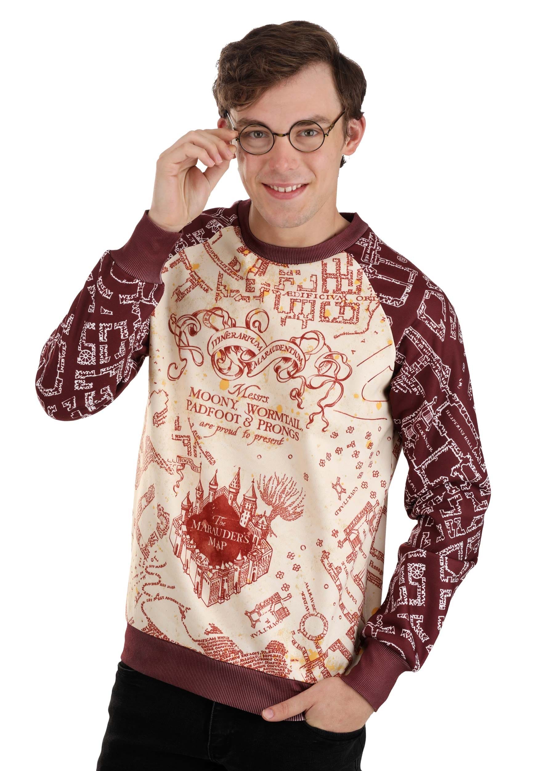 Confidently and cozily, tour Hogwarts in this exclusive Harry Potter Maurader’s Map Sweatshirt! This Made By Us pullover features a sublimated print of the legendary map that got Harry and his friends out of several sticky situations. Making your wanderings even safer, there are no named dots strolling the printed hallways so that you can read the layout of the castle without confusion. Though, you may prefer to simply walk your neighborhood, favorite shopping mall, or impress at your office holiday party in the two-toned sweater. Officially licensed and fit for adult sizes XS to 3X, this is a must-have garment for every Hogwarts alum and muggle!