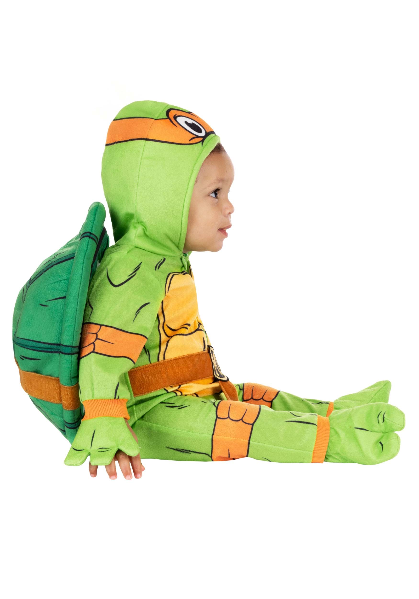 The costume includes a soft hooded onesie with a front zipper, making diaper changes way easier than fighting Shredder. The jumpsuit is printed with all the turtle-y details—like Michelangelo’s muscle shell, elbow wraps, and a built-in orange belt with a big "M" at the center so everyone knows who the party turtle is.
