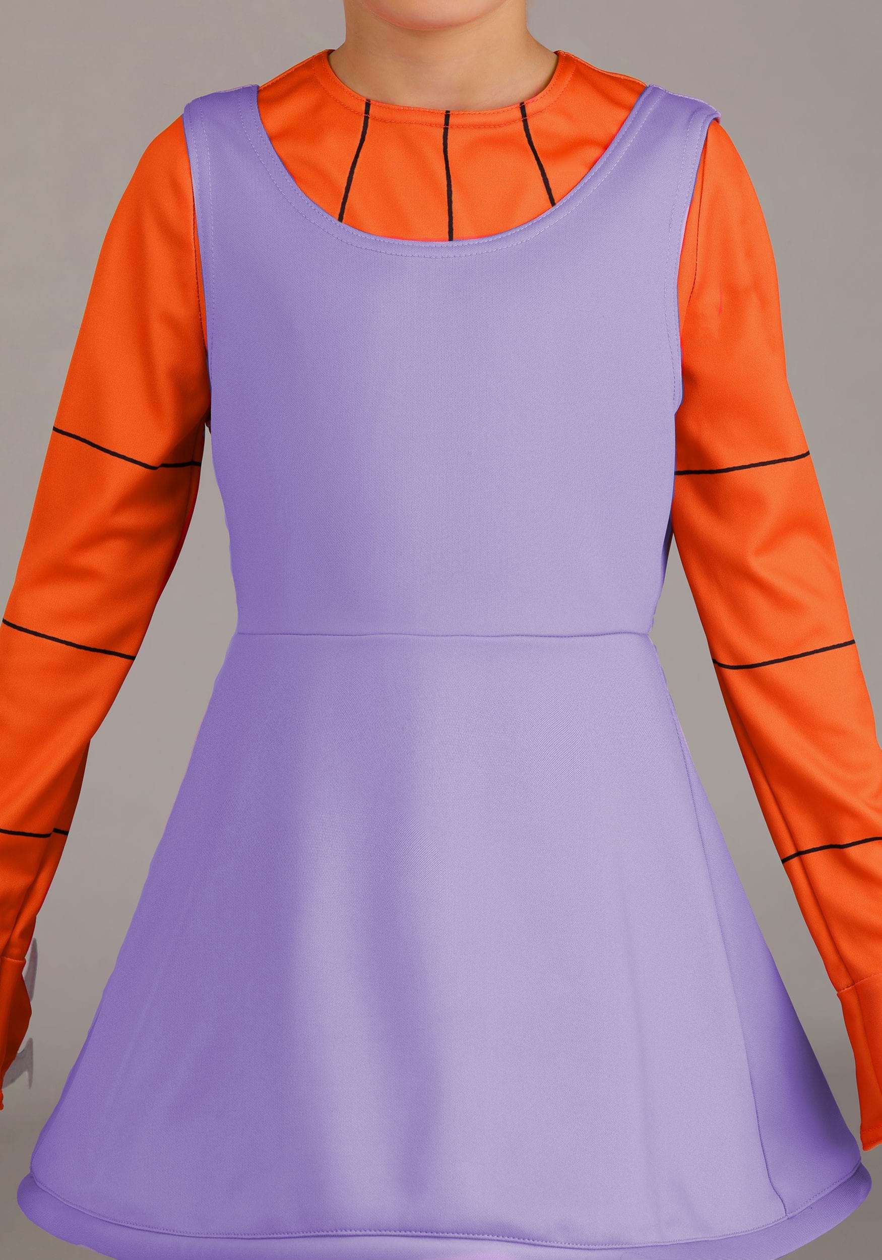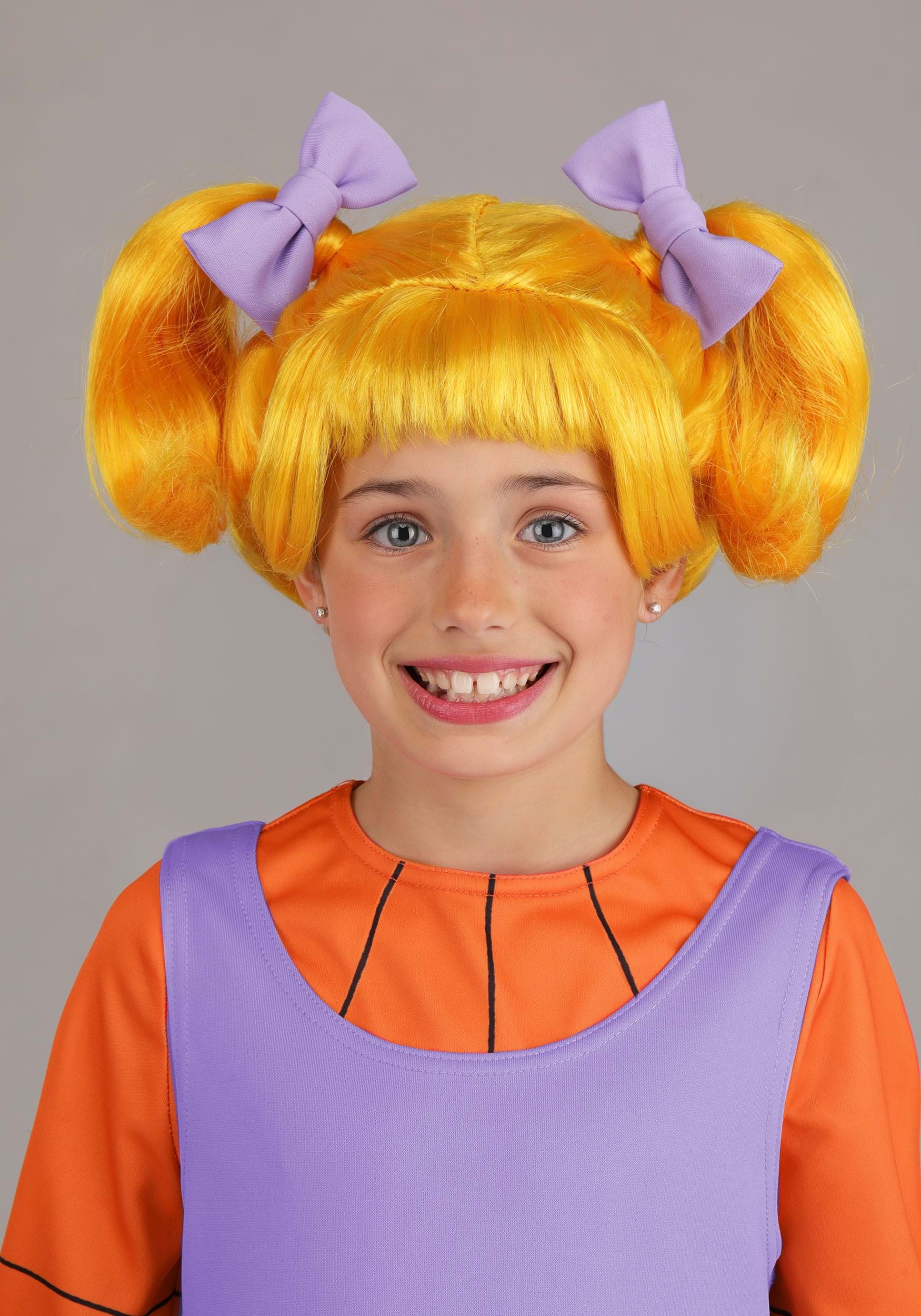 Let’s start at the top. The costume includes a yellow synthetic wig styled into Angelica’s signature pigtails with purple bows. It fits with an elastic cap to keep it secure while your kid makes dramatic declarations or explains how they would run the world.