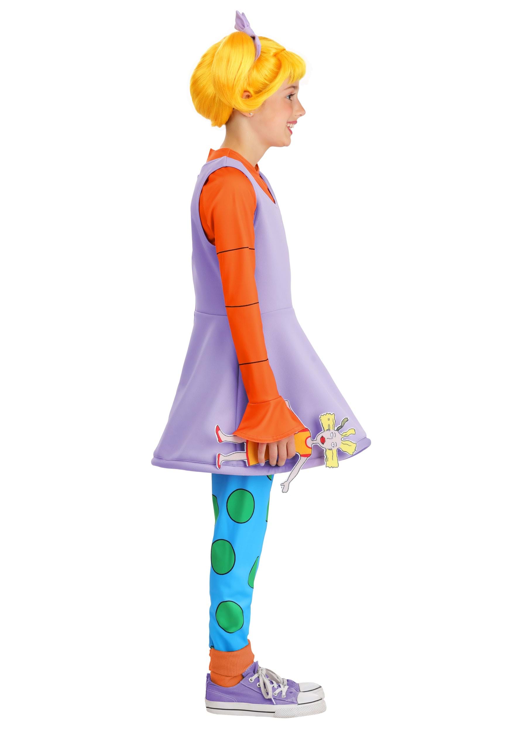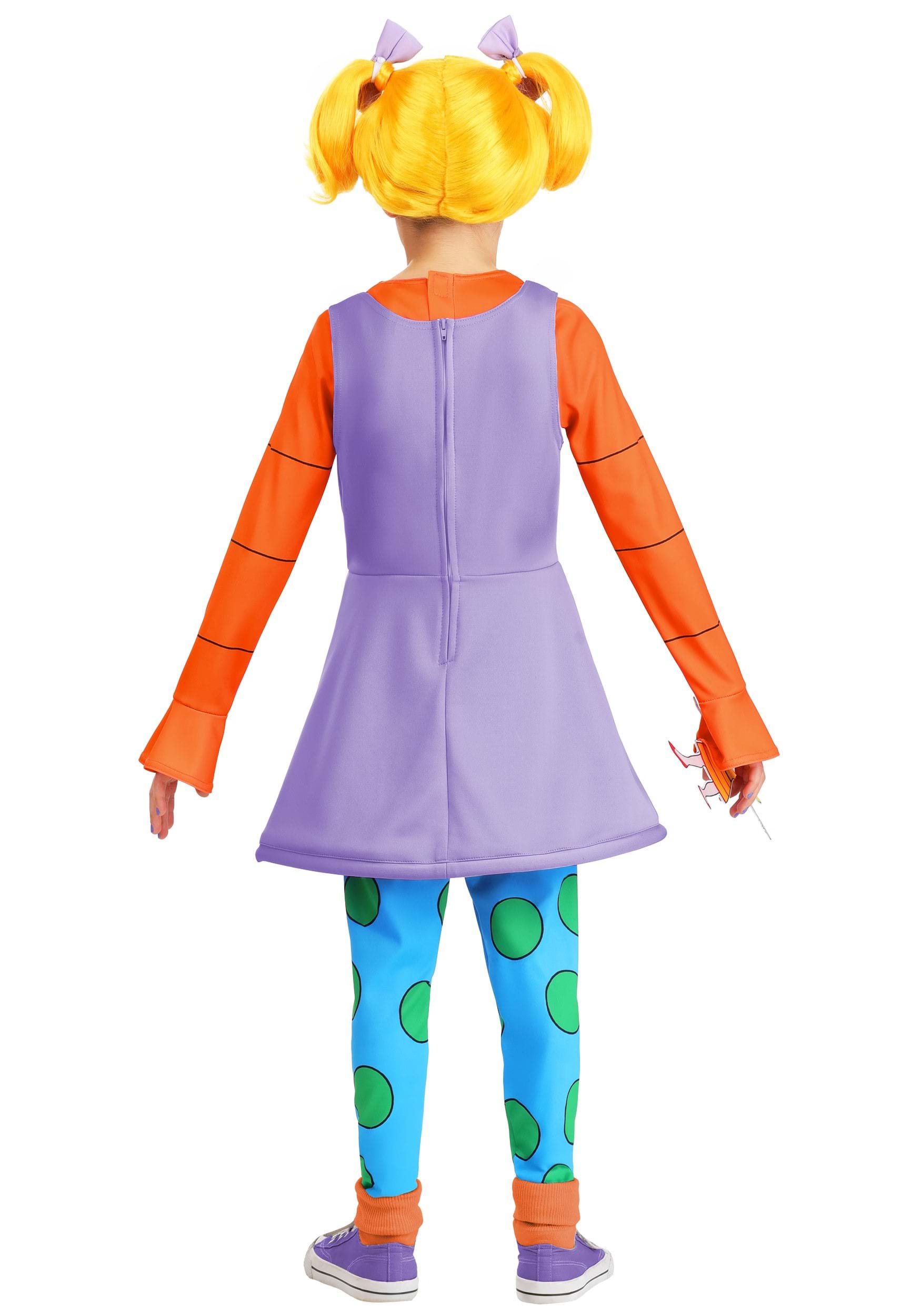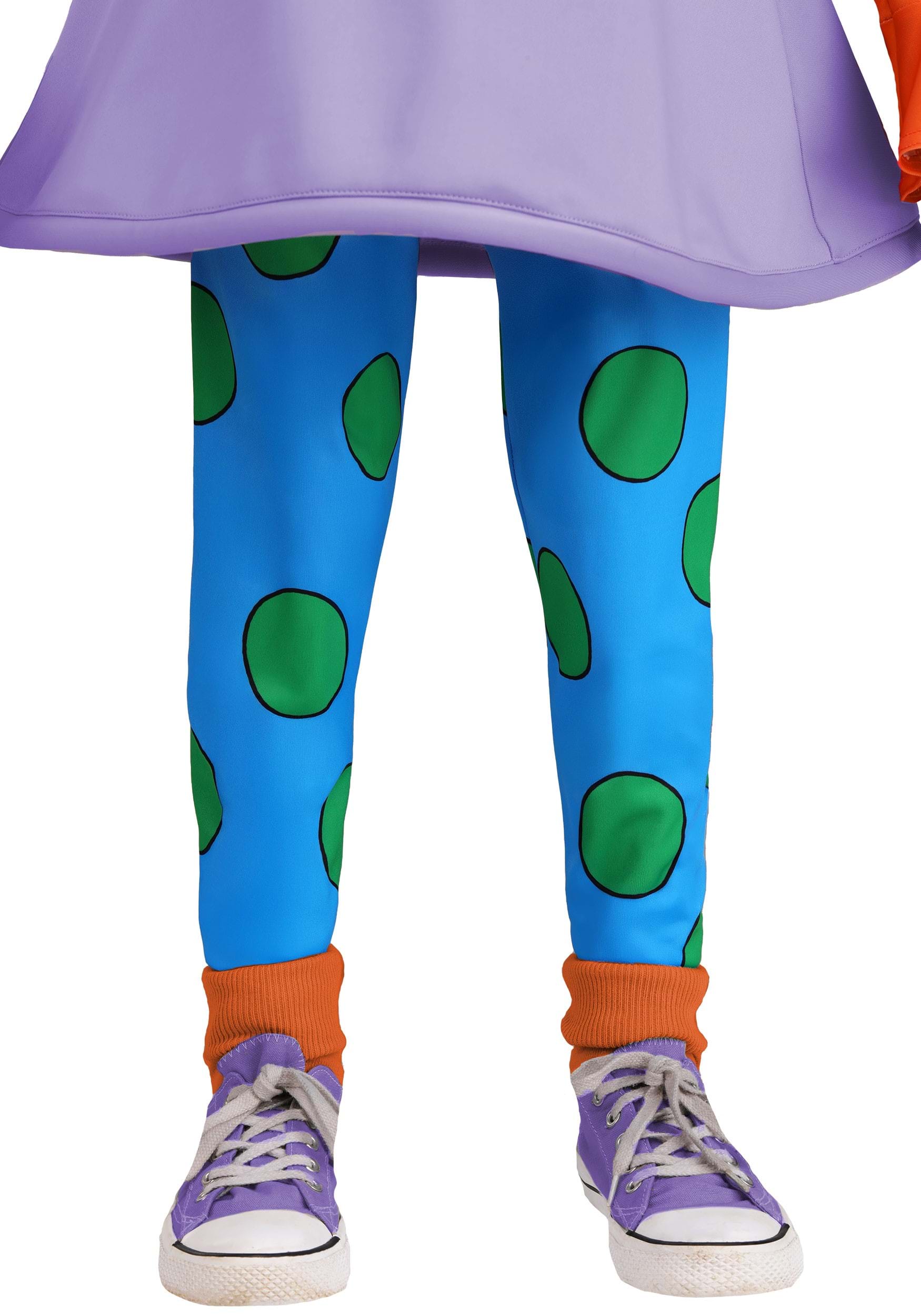 The dress has a purple knit design with an attached orange long-sleeve shirt, giving it the same layered look Angelica wears in the show. Matching leggings feature oversized green polka dots printed on bright blue fabric, and the stretchy waistband keeps them comfortable through snack breaks and costume parades. Orange socks are included to tie it all together.