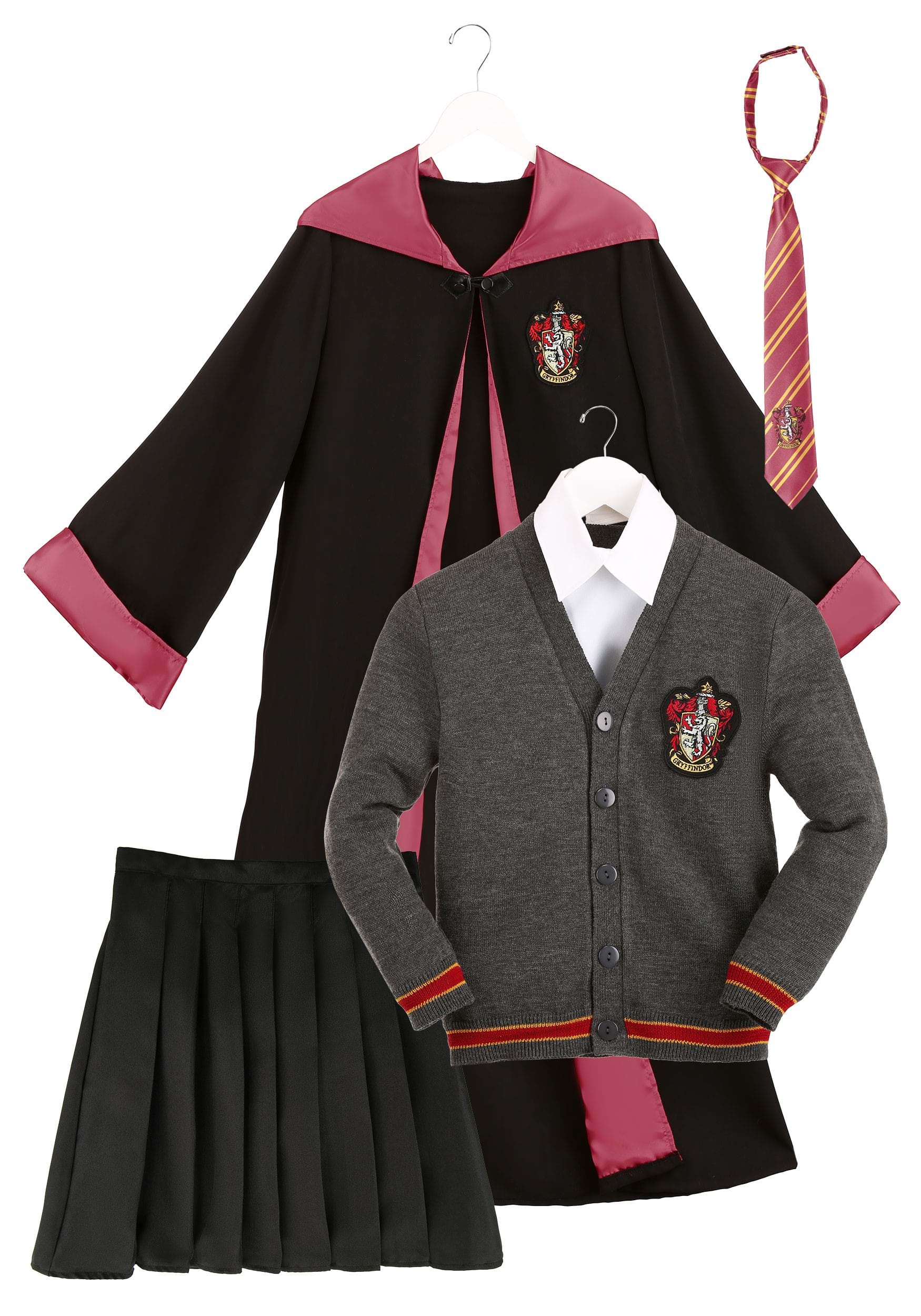 This Kid's Deluxe Harry Potter Hermione Costume is an officially licensed outfit from the Harry Potter movies. It's designed to recreate the Hogwarts outfit that Hermione wears and comes with a robe, a sweater, a shirt front, a skirt, and a tie. The full-length robe is black with a satin, burgundy interior. The front of the robe closes with a button and loop clasp on top with an attached, oversized hood in the back. It even features a Gryffindor crest right on the chest.