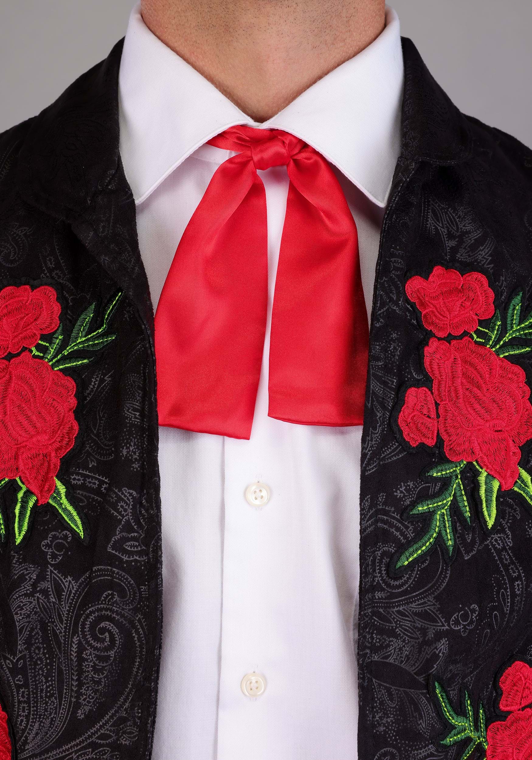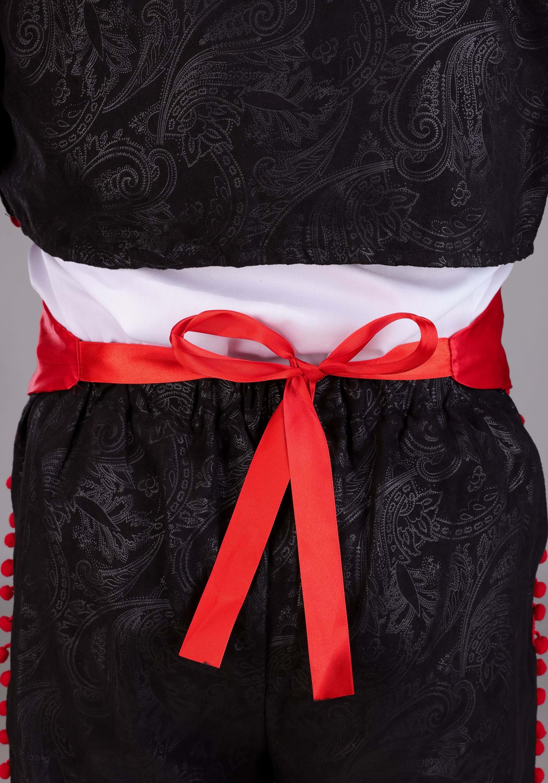 The suit is accented with a matching red satin necktie and a waist sash that secures with ribbon ties at the back. Complete with a wide brimmed sombrero, once this costume is paired with a white shirt and some great boots, it will be ready to celebrate with you at your next event!