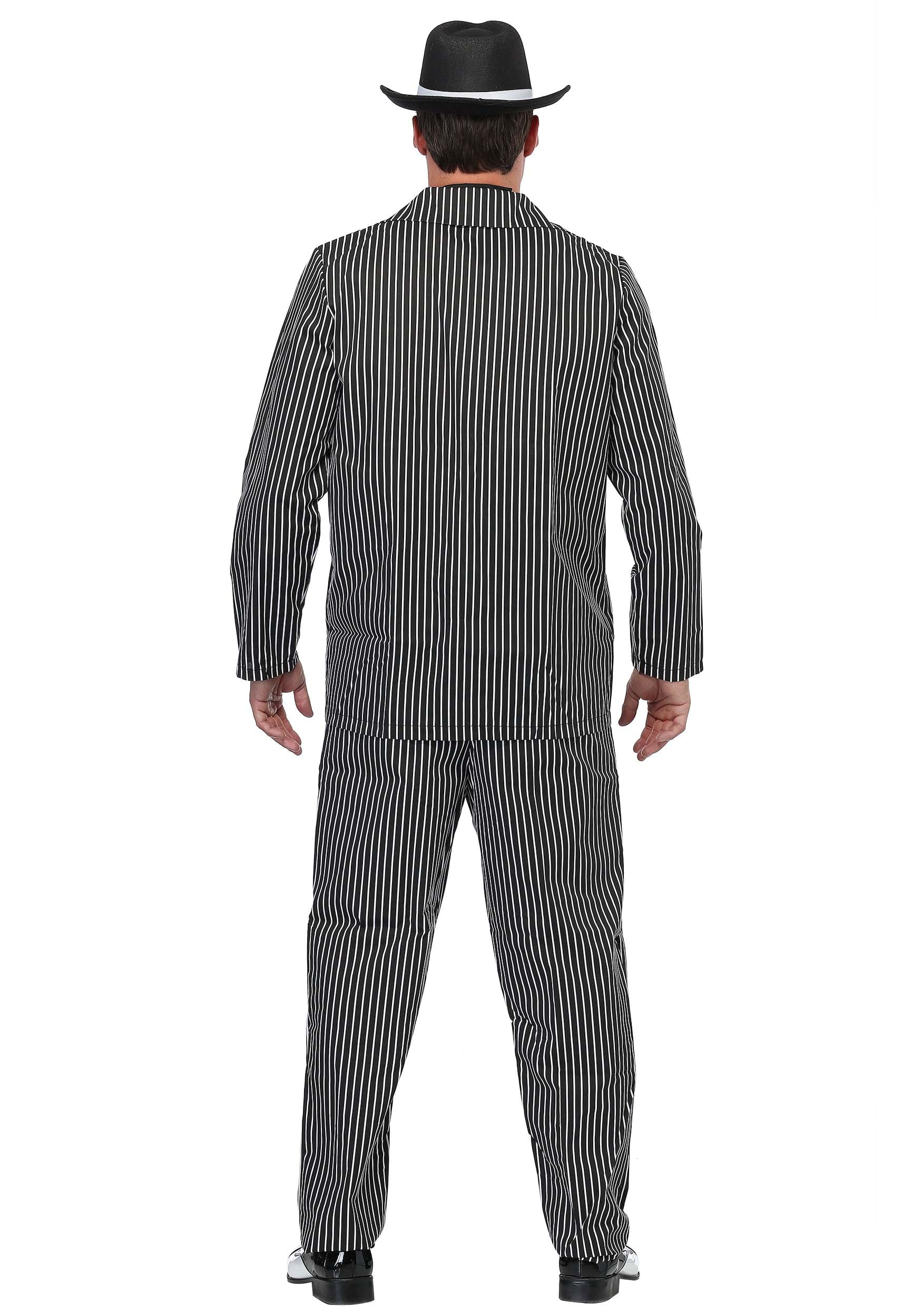 - Jacket and pants are black with wide white pinstripes