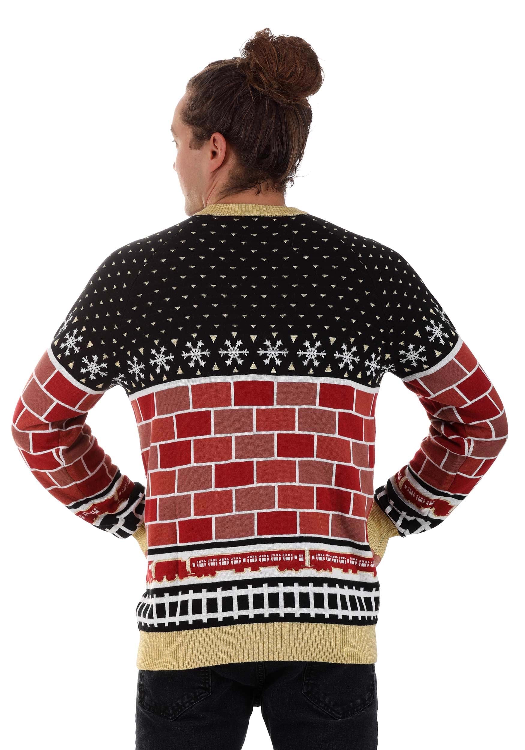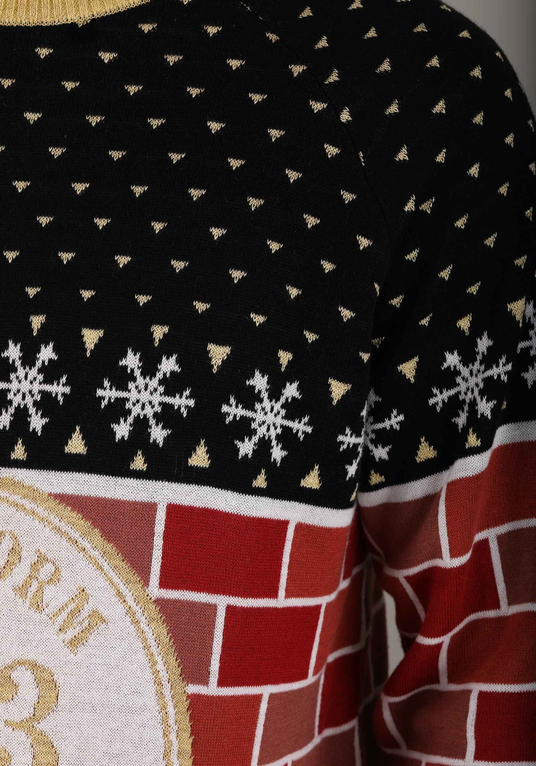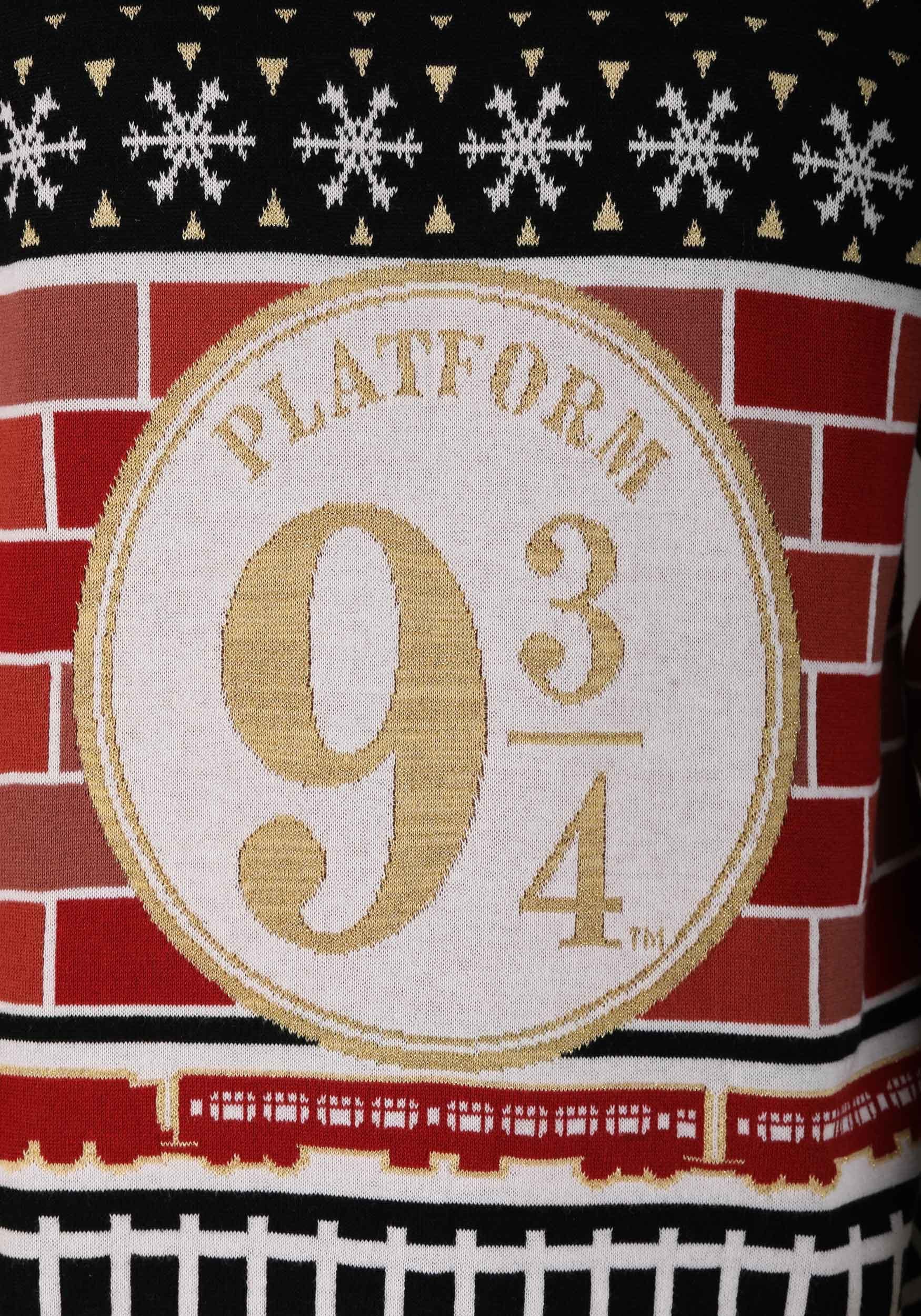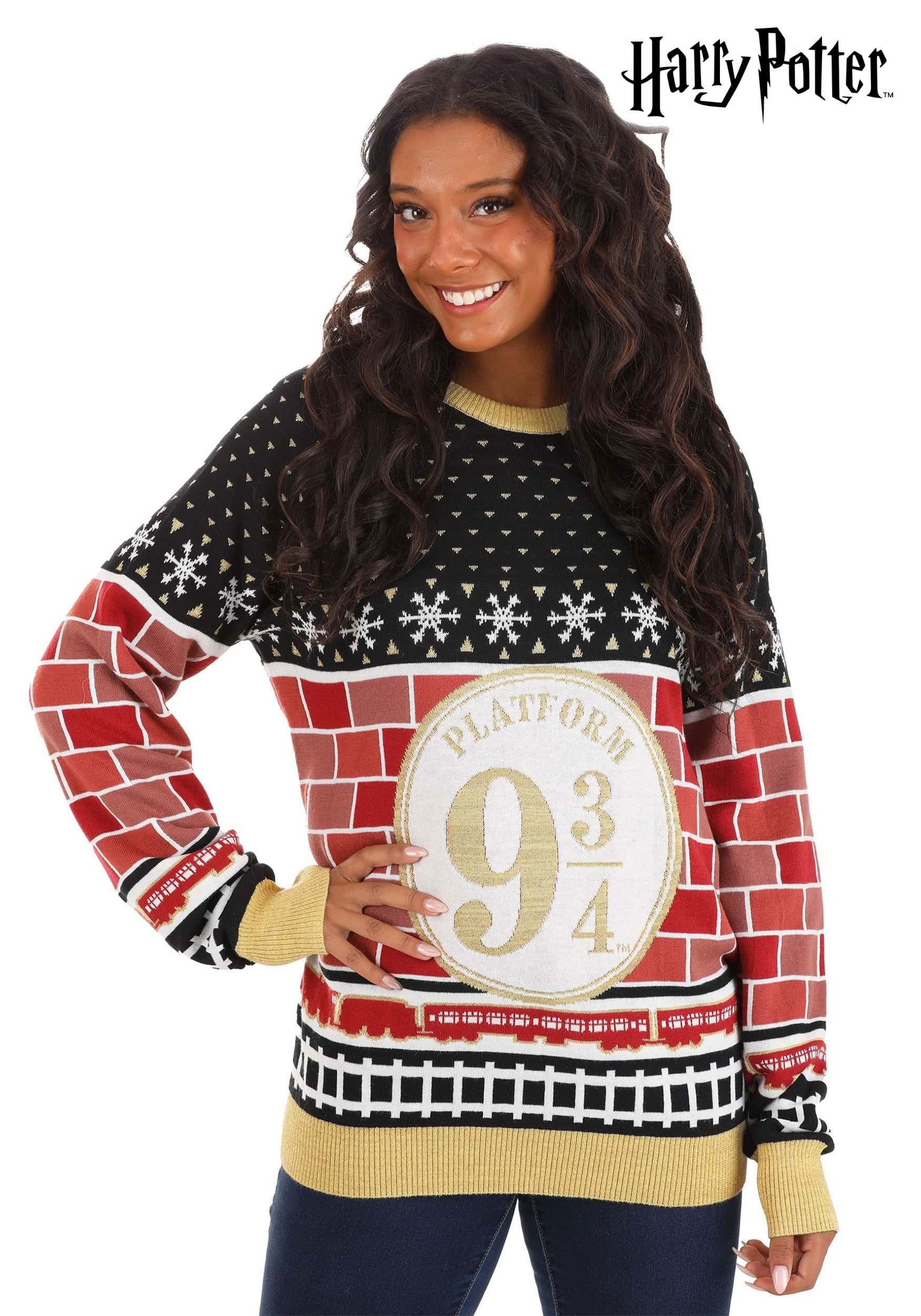 Celebrate Christmas like a wizard or a witch when you wear this exclusive, officially licensed Adult Platform 9 3/4 Harry Potter Christmas Sweater! The unisex sweater has knitted-in graphics of snowflakes, bricks, trains, and tracks. The center is decorated with a knitted-in white oval that reads "Platform 9 3/4." The collar, sleeve cuffs and hemline are made of rib knit material.