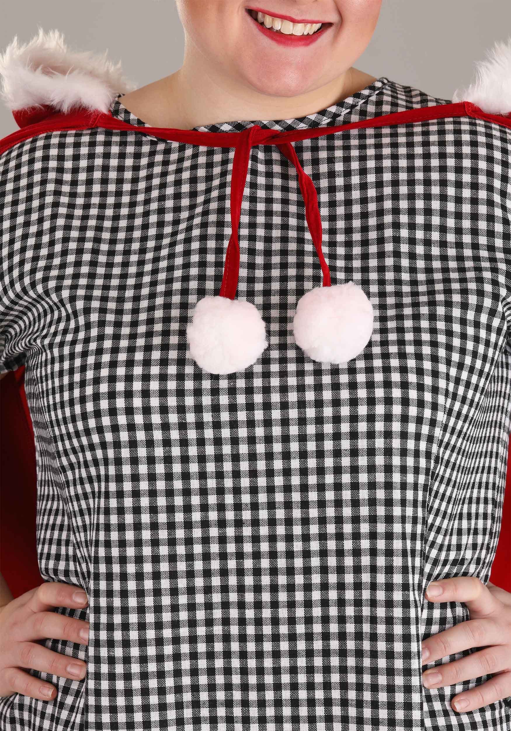 You might be almost ready for the holidays, and all you need now is the right outfit! Our Plus Size Christmas Girl Costume design was inspired by Dr. Seuss's famous character, and now you can look just like her with this dress and cape set. The short, checkered dress has puffed sleeves and satin ribbon to trim the hem. The red velvet cape ties at the front and has white faux fur trim along the edges.