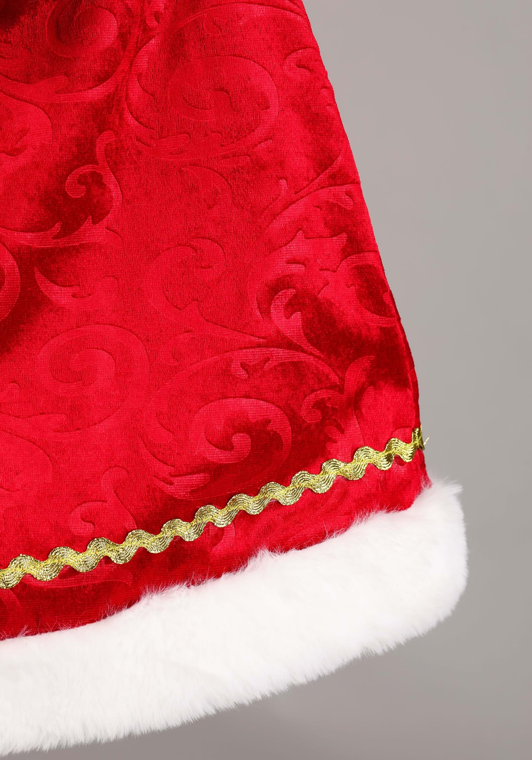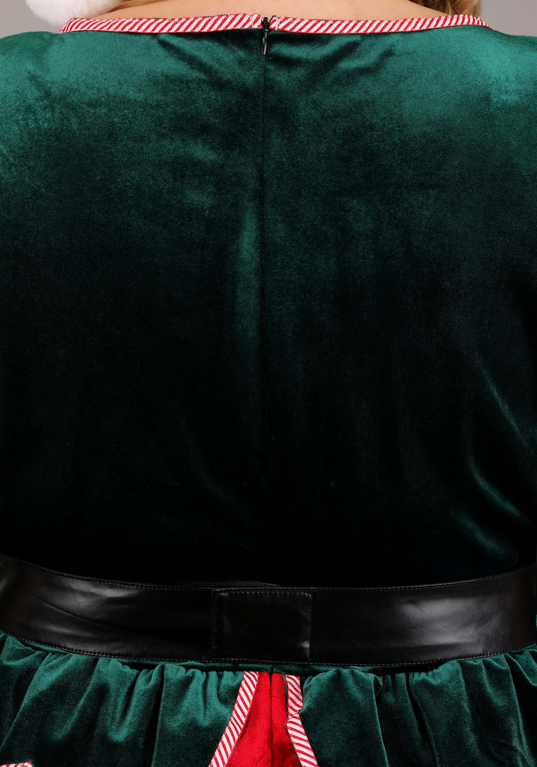 The velvet dress features a jacquard-patterned bodice and skirt with festive gold and candy cane ribbon accents. The puffed sleeves have elastic for a comfy fit, and the zipper down the back makes getting into elf-mode a snap. A tulle underskirt adds just enough fluff to say, “Yes, I take my elf duties seriously.”