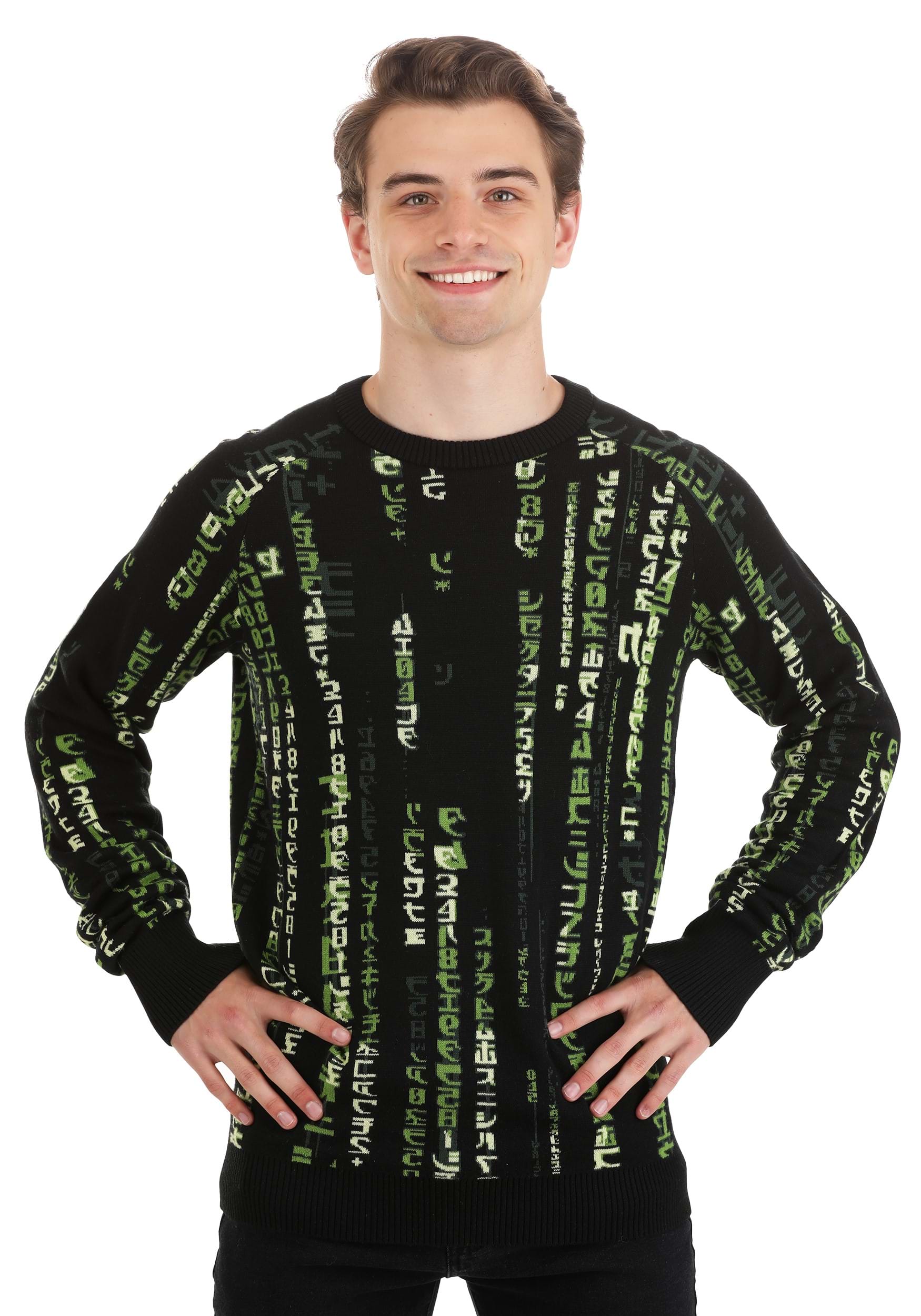 The falling rain effect of the visual Matrix code wowed audiences when the first movie debuted, and the imagery of the digital code has become a bit of a pop culture icon. From computer screensavers to countless imitations, it's instantly recognizable anytime you see it. So, we figured it's about time to feature it on an amazing piece of apparel! This Matrix Code Adult Sweater shows off the cool green characters of the code in amazing ugly sweater styling.