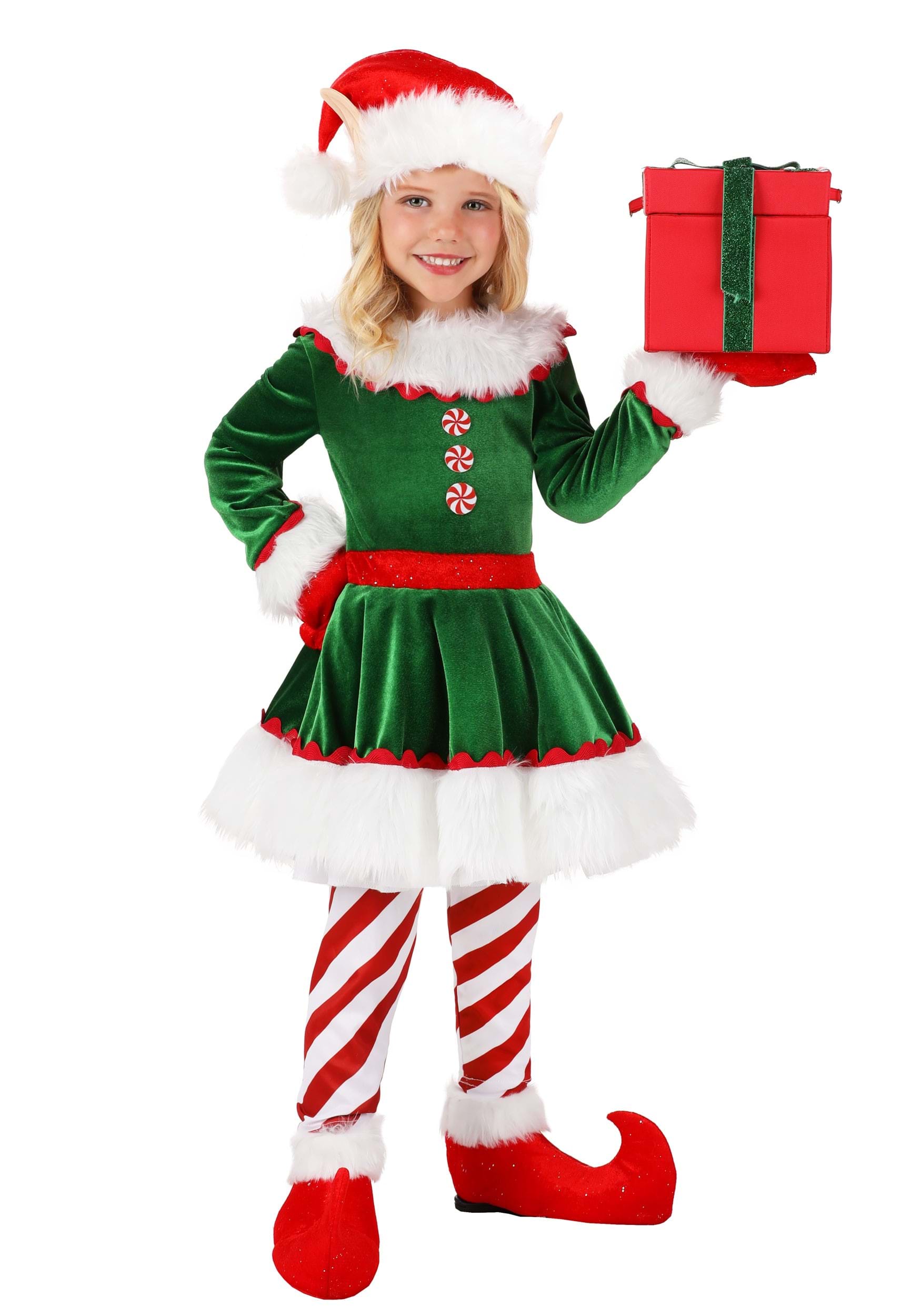 The dress itself is made of rich green velour with a zipper down the back for hassle-free dressing. The neckline, cuffs, and hem are trimmed in faux fur and finished with red ricrac for extra holiday flair. Three peppermint buttons adorn the bodice, and a layer of tulle beneath the skirt gives it a gentle bounce that’s ready for twirling—or toddling. The costume also includes red-and-white striped knit leggings with a soft elastic waistband for comfort and stretch. They add just the right dose of candy cane energy to an already sweet look.