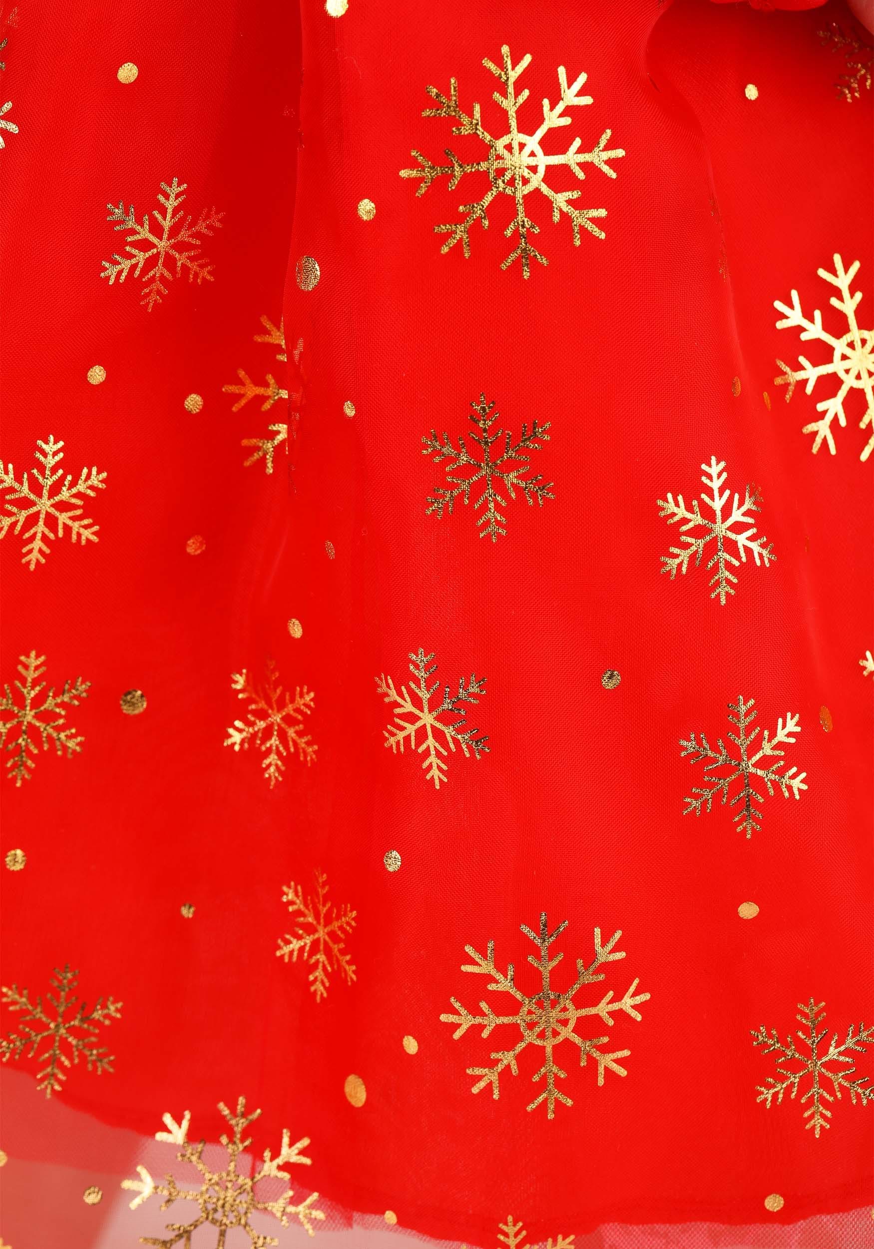 - Red sequins top w/ satin white strip, lace details, felt glitter snowflakes