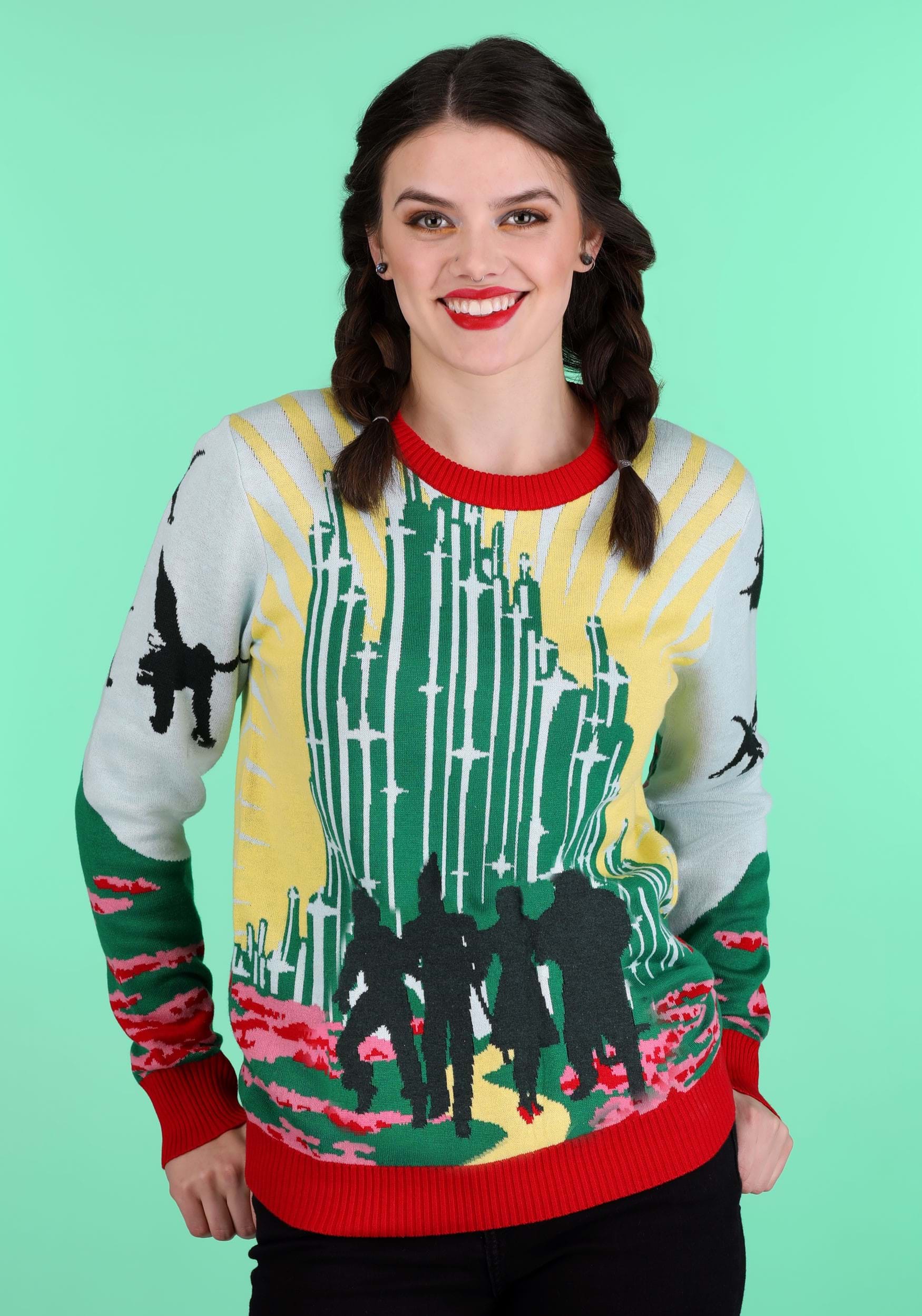 This Made by Us sweater is the ultimate gift for Wizard of Oz fans. Rich with thoughtful details, you'll find interesting Oz icons throughout the sweater from the flying monkeys on the sleeves to the sparkling Emerald City in the background. At The emerald and red colors will make you look festive at holiday parties while the timeless theme makes the sweater fit into your cold weather wardrobe after the New Year. Officially licensed, this Wizard of Oz sweater is the perfect piece to wear while you're traveling home for the holidays whether you're skipping down the yellow brick road or traveling via twister!