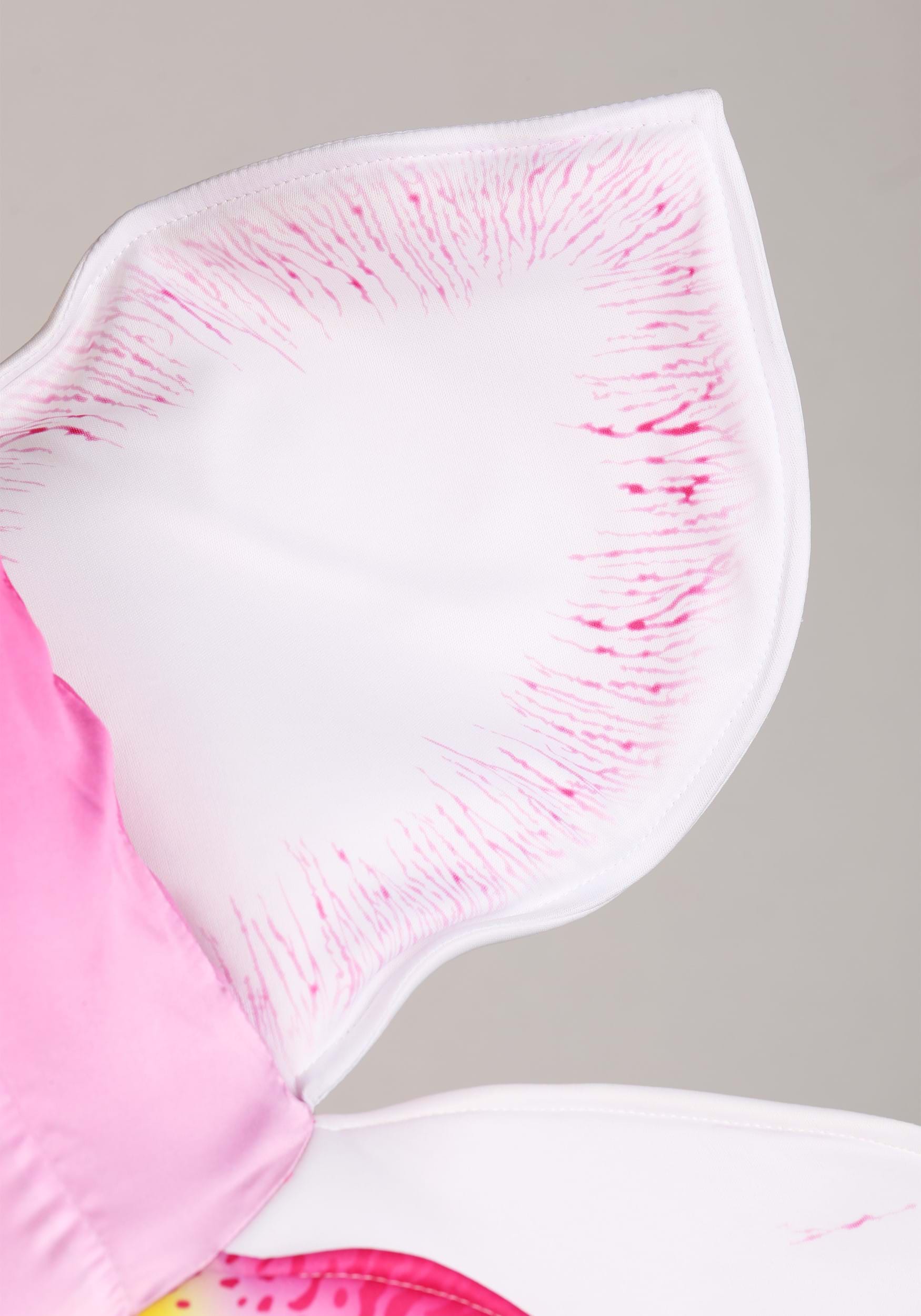 This one-piece costume is built as a jumpsuit, with lush green velour pants that mimic a leafy stem and balance out the bright drama up top. Attached to the waist and back are oversized orchid petals in pink and white, with soft printed veining and structured shaping to help them keep their flair while you work the room.
